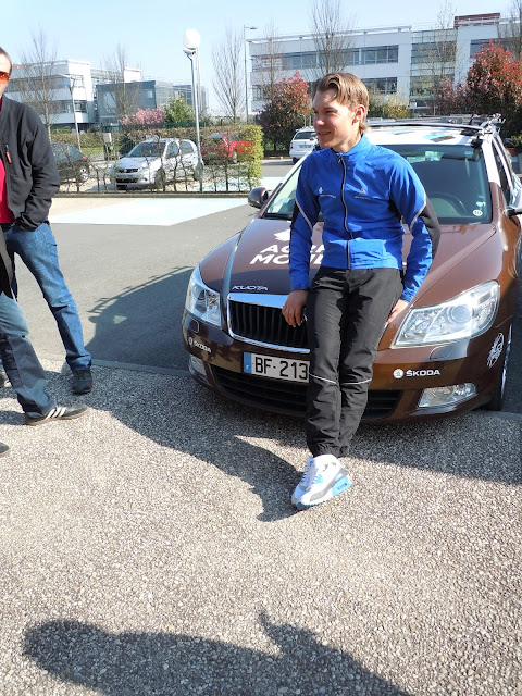 I raced back to the Gite and after a delicious lunch of soup and quiche, we headed towards Lille to meet up with the AG2R to meet a couple of the cyclists as well as the Sportif Directeur, Vincent Levanu. We visited with Kristof Goddaert and Steve Houanard, the only 2 on the team that felt confident enough with their English to stand in front of a bunch of English-speaking blokes. We asked them all sorts of questions, like what are you looking forward to in the race, how do you hope you do, what your job for the race, etc. Kristof was anticipating getting in a break - both were, actually. Steve wanted to be sure and finish - he had to give up a wheel to a teammate last year and was forced to abandon. They were very patient and happy to visit with us - quite genuine and rather humble considering their fortunate professions! I did spot both of them on Sunday and as it turns out, Kristof finished 18:54 behind Boonen and Steve ended up DNF. Not sure why or how, but perhaps he did his duty for Jimmy Casper and gave up a wheel? Regardless, they both did and exceptional race and helped Casper take a 19th position, 4:37 behind Boonen. Incredible. Thanks, again, to William and Alex for making that happen - really helped us see the race from a deeper perspective for sure! William and Alex know Vincent from when their employer, B'Twin, sponsored the team years ago under the name Decathlon.